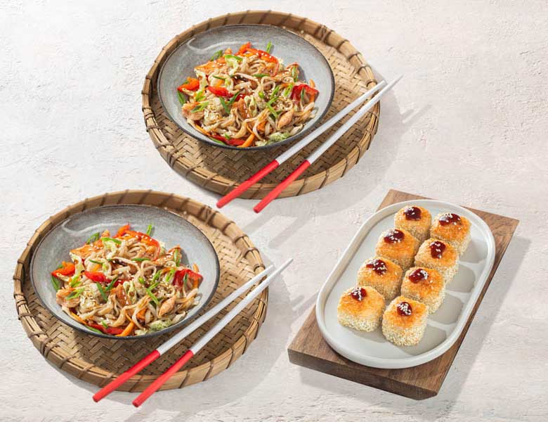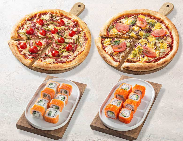 Пицца Чикен BBQ (30 см), Пицца Фьюжн (30 см), Ролл Фуджи, Ролл Филадельфия.