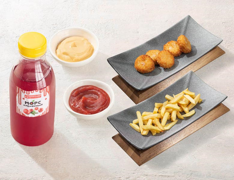 Фреш-ролл с цыпленком (сочная котлета из куриного бедра, салат Айсберг, помидоры, соус Цезарь, сыр Пармезан), картофель фри, клюквенный морс (500 мл).