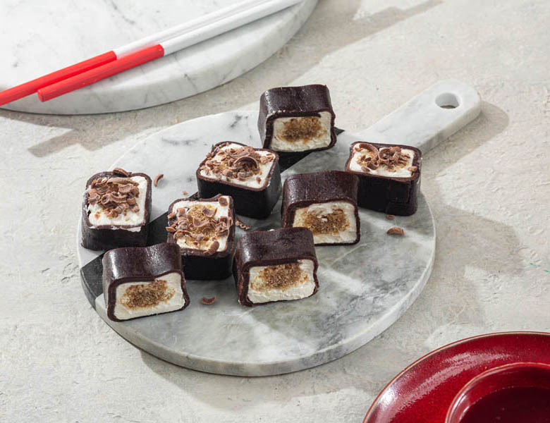 Классический ролл с нежным кремом Маскарпоне и пропитанным в кофе печеньем Савоярди, шоколадный блинчик (мука, молоко, какао, сахар, яйцо, масло растительное).